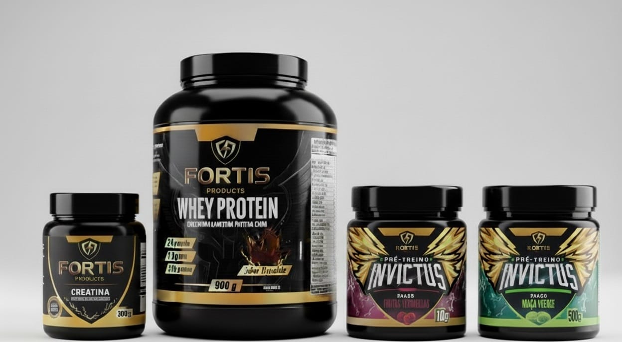 Esse KIT é composto de: 1 Whey Protein FORTIS Pote de 900g + 1 produto (Creatina pote de 300g ou Pré-treino pote de 300g qualquer sabor)